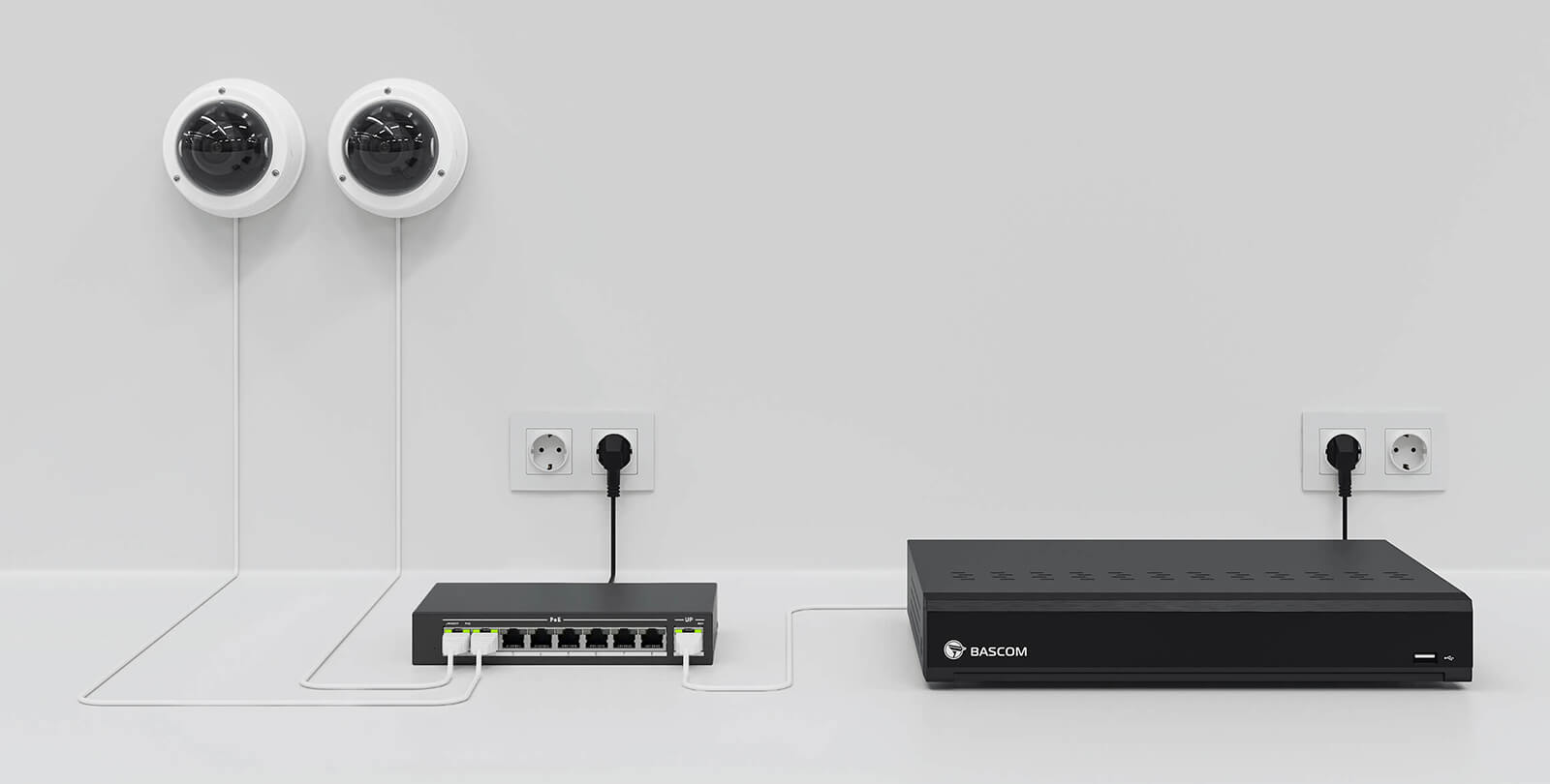 Med en PoE-switch kan du smidigt integrera kamerasystemet i ett befintligt nätverk. Switchens uppgift är att ansluta kamerorna till nätverket och samtidigt förse dem med ström. När även inspelaren är uppkopplad mot samma nätverk upprättas automatiskt en anslutning till kamerorna.
